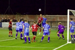 Following a period of pressure from the home side – Jack Freeman firing wide, Horrell to the front edge of the visitor’s box and Morris a run to the left byline – Thornbury launched the ball to their right corner for Harry Brock to run to the byline and gain a corner kick that resulted in a shot that was blocked.